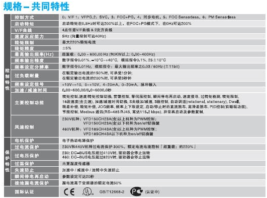 起動轉矩: 0.5Hz時可達200%以上;FOC+PG下,在0Hz可達200%
